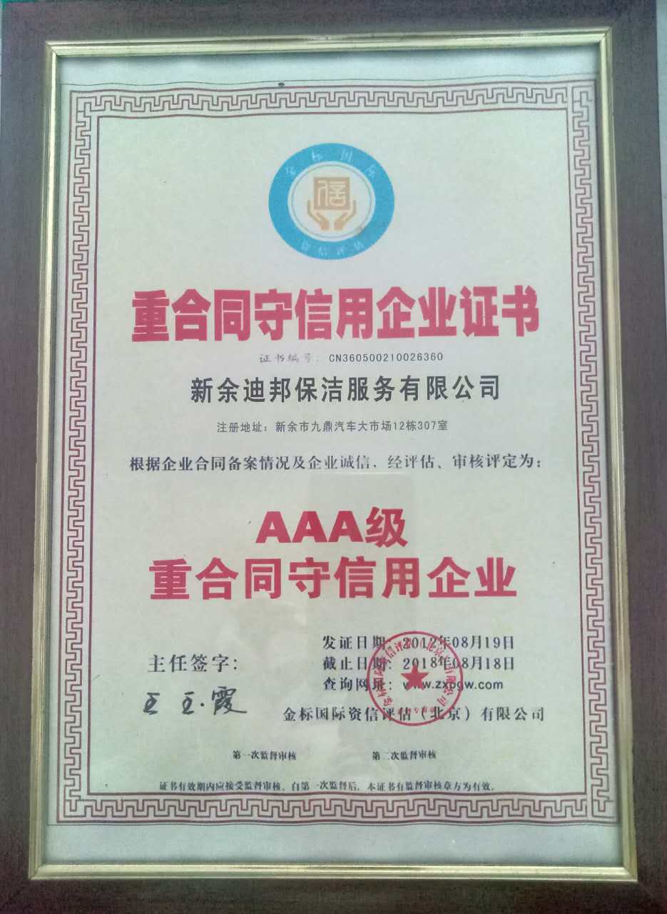 新余迪邦保潔服務(wù)有限公司獲得北京金標(biāo)國(guó)際資信有限公司評(píng)為AAA級(jí)重合同守信用企業(yè)